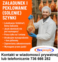 Miejsce pracy: 48465 Schüttorf / Niemcy Rozpoczęcie pracy: od zaraz Czas pracy: zmiana poranna, 40 godzin/tydzien, 06:00-15:30 Wynagrodzenie: 13,82 € brutto / godzina + dodatki Zakwaterowanie: możliwe, koszt 350 € miesięcznie Nasz partner to tradycyjna rodzinna firma z siedzibą w Schüttorf, która od pokoleń specjalizuje się w produkcji wysokiej jakości wędlin i specjałów mięsnych. Przedsiębiorstwo łączy rzemieślniczą precyzję z nowoczesną technologią, a jego produkty trafiają również na rynki międzynarodowe. Firma stawia na jakość, dokładność i zrównoważone procesy produkcyjne – to pracodawca, dla którego duch zespołu i niezawodność są równie ważne jak sam produkt. Twoje zadania: • Załadunek i rozładunek ciężarówek • Solenie (pekling) szynki – praca w bezpośrednim kontakcie ze świeżym mięsem • Czyszczenie skrzyń i stojaków do wędzenia • Załadunek prasy do szynki • Załadunek komór wędzarniczych i klimatycznych • Dbanie o standardy higieny • Praca w temperaturze od 3 do 6 stopni Celsjusza Wymagania: • Niezawodność, umiejętność pracy w zespole oraz odporność na pracę fizyczną • Doświadczenie w produkcji spożywczej będzie atutem • Gotowość do pracy w systemie zmianowym (zmiana poranna/południowa) • Podstawowa znajomość języka niemieckiego mile widziana, ale nie wymagana • Prawo jazdy, własny samochód będzie atutem dodatkowym • Wymagane zaświadczenie zdrowotne zgodne z § 43 IfSG (Jeśli jeszcze go nie posiadasz, organizujemy szkolenie – koszt ok. 26 €, certyfikat ważny przez 2 lata) Oferujemy: • Bezpośrednie zatrudnienie u klienta – bez pośrednictwa agencji pracy tymczasowej • Niemiecka umowa o pracę z możliwością długoterminowego zatrudnienia • Atrakcyjna stawka: 13,82 € brutto/h • Dodatki: 25% za nadgodziny, 50% za pracę w soboty • Miesięczny bon paliwowy (50 €) • Możliwość zaliczek po uzgodnieniu • Zakwaterowanie (maks. 2 osoby w pokoju, koszt 300–350 € miesięcznie) • Bezpłatna odzież robocza • Wsparcie koordynatora mówiącego w Twoim języku W przypadku braku wlasnego transportu jest mozliwosc dojazdu samochodem sluzbowym. Koszt 60€ mies. plus koszty paliwa. Jak to działa Flexpeople towarzyszy Ci od momentu zgłoszenia aż do rozpoczęcia pracy. Pomagamy w organizacji dojazdu oraz przygotowujemy wszystkie niezbędne dokumenty. Po Twoim przyjeździe zajmie się Tobą bezpośrednio nasz partner na miejscu. Będziesz mieć stałego opiekuna, który pomoże Ci w kwestiach związanych z pracą, mieszkaniem i codziennym życiem. Dzięki temu od pierwszego dnia możesz skoncentrować się w pełni na swojej nowej pracy. Brzmi jak praca dla Ciebie? Skontaktuj się z nami – mailowo, przez WhatsApp lub telefonicznie. Odpowiemy na wszystkie Twoje pytania i pomożemy Ci rozpocząć pracę.